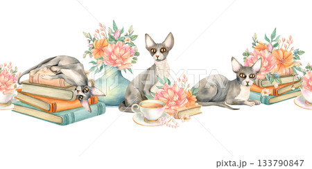 Sphynx cat with flowers seamless border. Sphinx kitty is lying on stack of books, sit with jewel, cup of tea. Floral vase vintage animalistic composition. Cozy spring watercolor isolated illustration
