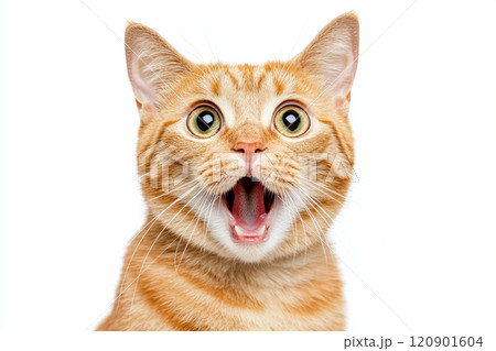 Playful orange cat with wide open mouth against a vibrant yellow background