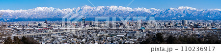 富山市全景のパノラマ立山連峰立山あおぐ特等席呉羽山展望台から毛勝山、剱岳、立山連邦富山市街地の雪景色