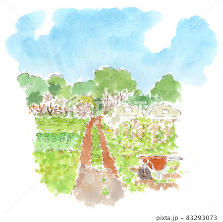 畑と一輪車。轍のある一本道が林に続いている風景。の水彩画イラスト