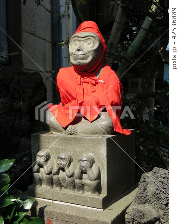 東京観光スポット・山王日枝神社拝殿脇の神猿像(男猿)・縦位置