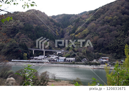 円山川の河岸を走るJR山陰本線の列車(玄武洞駅付近)