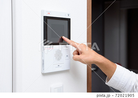 マンションのインターホンをタッチする男性 テレビドアホン