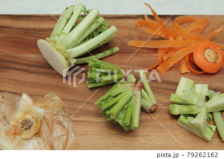 野菜コンソメスープを作る工程 野菜を刻み煮込む セロリの筋,取る