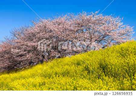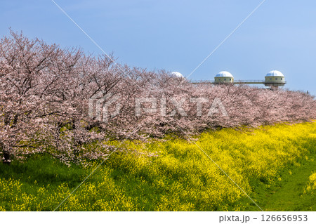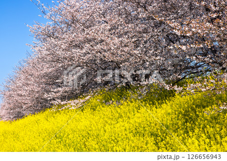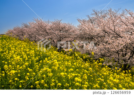 埼玉県熊谷市玉作 荒川支流の和田吉野川沿い玉作水門付近の桜並木 ソメイヨシノ並木と菜の花畑