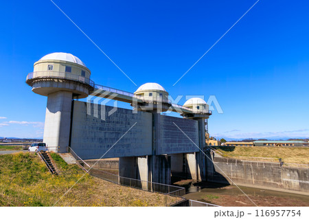 夕暮れの広大な葦原にある巨大な玉作水門。 日本国埼玉県、荒川河川敷にて。 2024年3月23日撮影