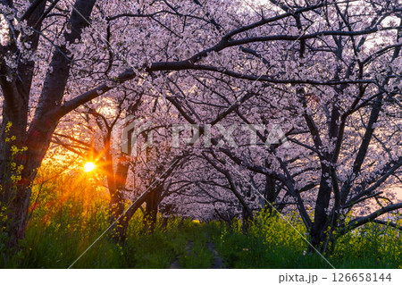 埼玉県熊谷市 荒川支流の和田吉野川の玉作水門付近の桜並木 ソメイヨシノのトンネルと菜の花畑と朝陽