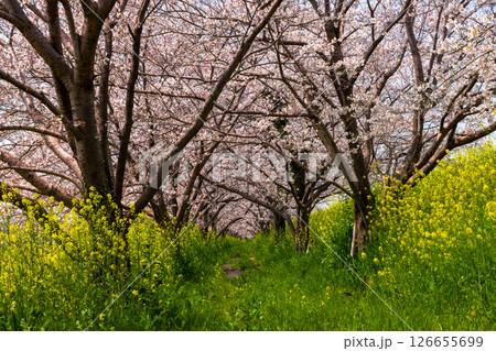 埼玉県熊谷市玉作 荒川支流の和田吉野川沿い玉作水門付近の桜並木 ソメイヨシノのトンネルと菜の花畑