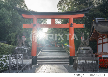 京都 伏見稲荷大社 玉山稲荷社 朱鳥居に朝日