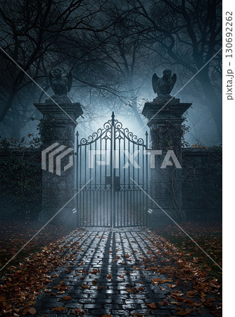 Dark and Foggy Night Path Leading to Cemetery Gates