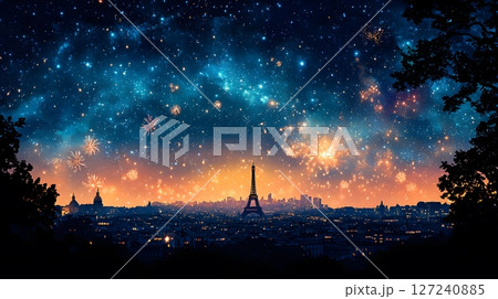 Eiffel Tower lit up with fireworks on Bastille Day night, crowd watching from Seine river