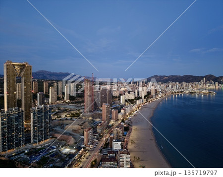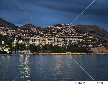 Evening coastal horizon with waves, Coastline at dusk featuring resorts and beach waves beneath clouds