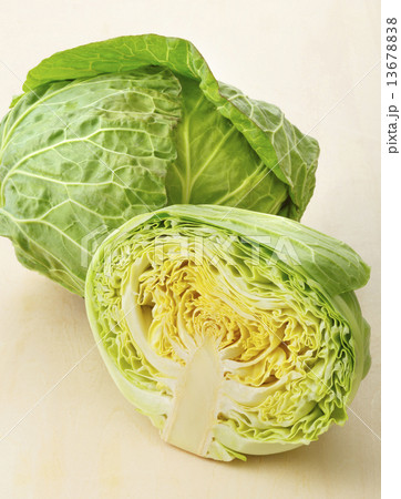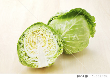 新鮮なキャベツ カットイメージ ( 木目背景 )