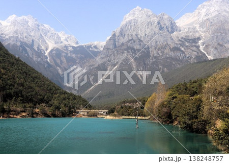 早春の雪山と湖と滝 玉龍雪山 雲南省 中国 アジア