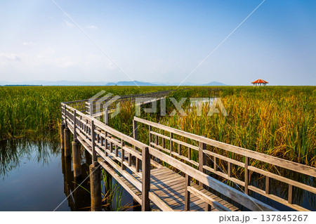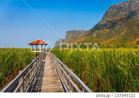 Beautiful landscape of wooden bridge walkway in swamp with grass field with blue sky mountain range background in Khao Sam Roi Yot National Park, Kui Buri District, Prachuap Khiri Khan, Thailand