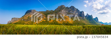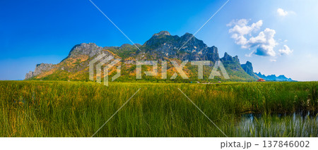 Beautiful Panorama landscape of mountain with grass field and blue sky range background in Khao Sam Roi Yot National Park, Kui Buri District, Prachuap Khiri Khan, Thailand