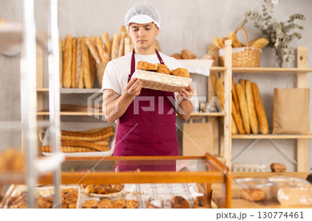 Diligent guy baker offers to buy fresh delicious croissants