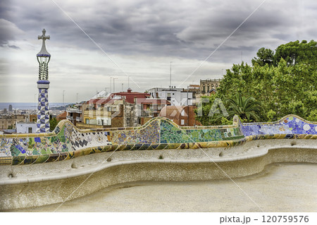 Colorful main terrace of Park Guell, Barcelona, Catalonia, Spain