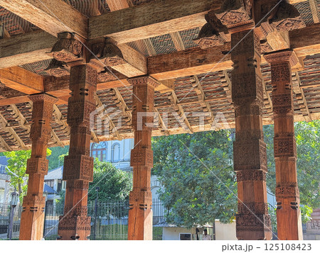 王の集会所の柱の装飾と梁と屋根、仏歯寺、世界遺産キャンディ