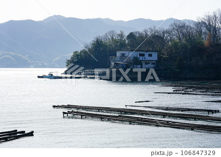 安徳天皇伝説が伝わる蹴り小島 抑制棚の牡蠣養殖(広島県江田島市)