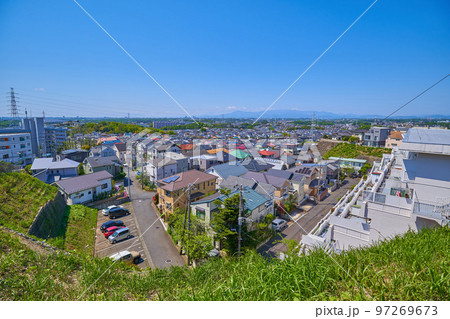 春の神奈川県川崎市麻生区の王禅寺見晴し公園から西側の風景(王禅寺西2丁目,丹沢山系,富士山など)