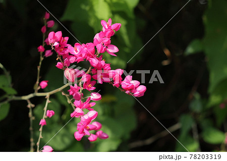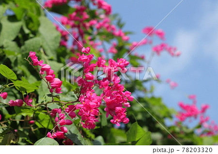 Bright pink flowers in a garden. Perennial plant Mexican Coral Vine, Coral Creeper, Honolulu Creeper, Corallita, Chinese Love Vine in full bloom on blue sky background