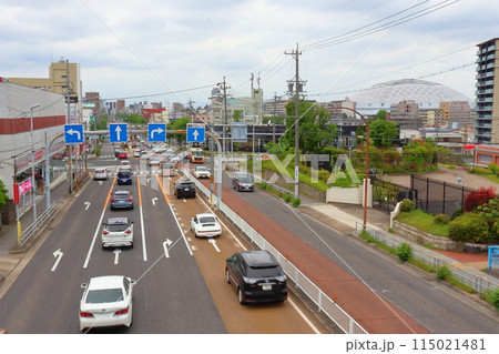 直進レーンに挟まれた名古屋の不思議な右折レーン(背後にナゴヤドーム)
