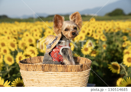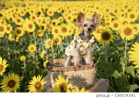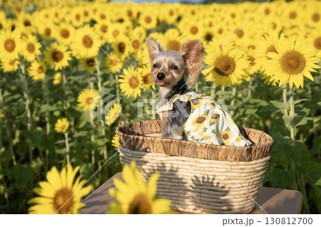 早朝の向日葵畑とヨークシャテリア