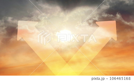 スピリチュアルなオレンジの空に2方向の矢印_ワイド