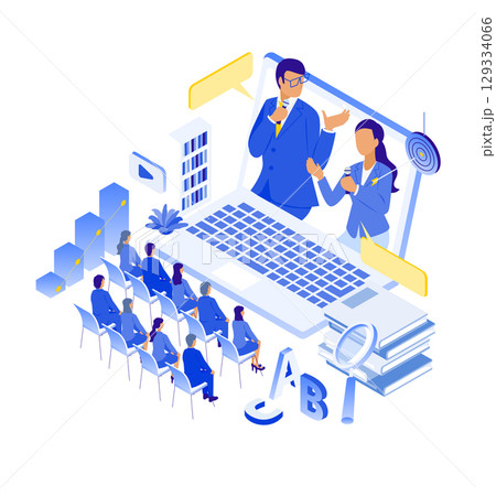オンライン講義を受講する聴衆と大型ノートPC上の講師イラスト(アイソメ)