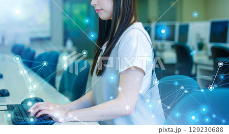 パソコン教室でタイピングをする女子学生