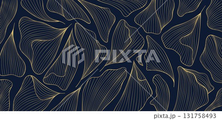 Vector art deco line leaves pattern, linear gold on blue floral luxury nature texture, elegant foliage background. Nouveau fancy jungle print. garden ornament, botanical exotic wallpaper.