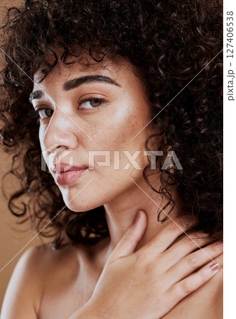 Skincare, hair care and face of a woman with makeup, beauty and natural glow against a brown studio background. Salon, luxury and portrait of a model with cosmetics and wellness care for afro hair