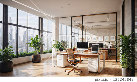 modern office with natural light, wooden desks, lush greenery, and panoramic windows showcasing a stunning urban skyline for an inspiring and productive workspace