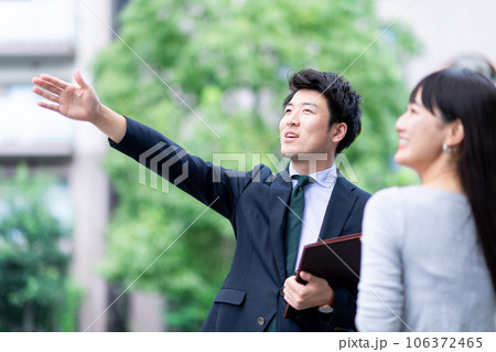 現地案内する不動産業者の男性と女性客