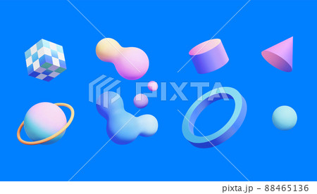 3d render gradient shape objects. Abstract sphere, circle ball, futuristic geometry neon metal. Holographic minimalist objects. Cube spiral and cone isolated background. Vector design exact elements