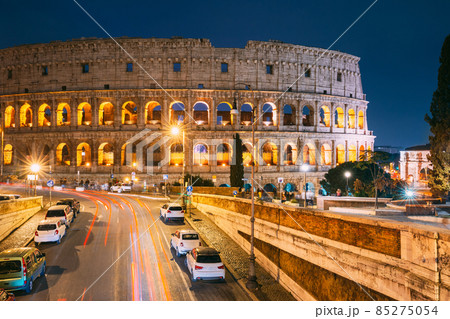 Rome, Italy. Colosseum View From Another Side In Night Time. Night Traffic Light Trails Near Famous World Landmark
