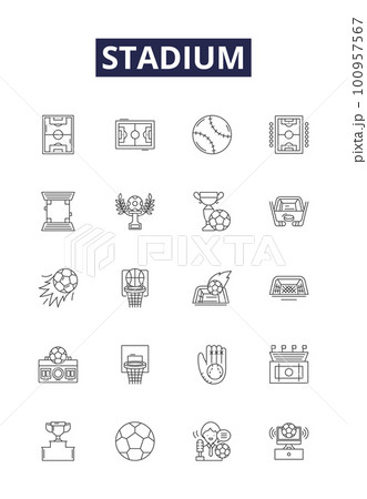 Stadium line vector icons and signs. Arena, Grounds, Court, Field, Park, Pitch, Parkland, Playground outline vector illustration set