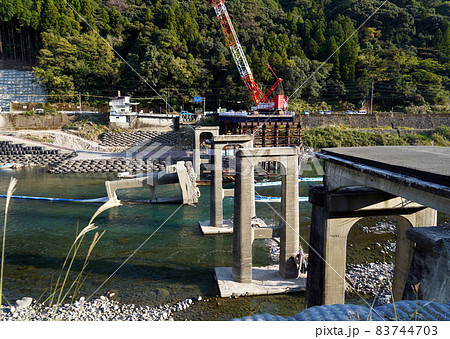 球磨川の氾濫で流出した神瀬橋の解体作業風景、2020年7月の熊本豪雨災害で壊れた橋の撤去作業、