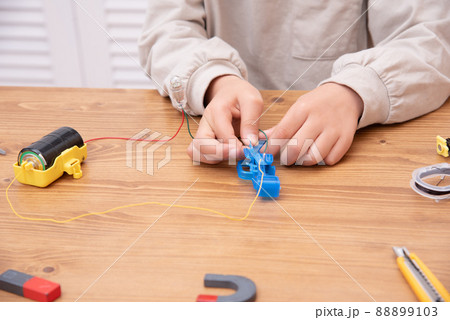 小学3年生の理科の勉強で豆電球の実験をするアジア人の男の子
