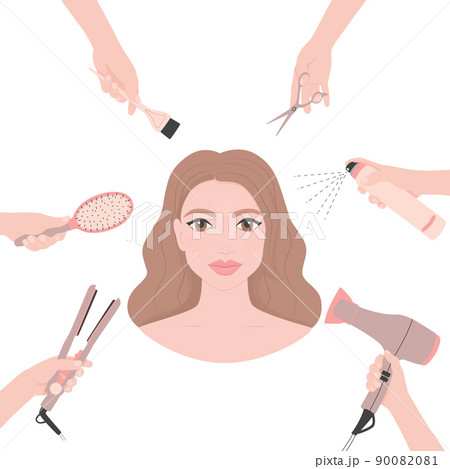 Young female customer in hair salon. Hairdresser serves beautiful woman. Concept of haircuts, coloring, hair care. Cartoon vector illustration.