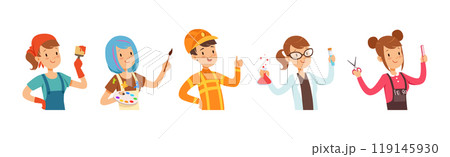 Kids professions. Cartooning science occupation, profession child with book and lab equipment. Children in various industry, decent set