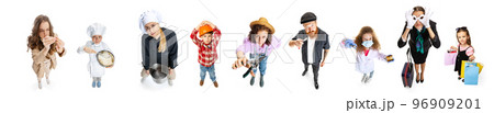 Set of full-length portraits of little boys and girls, children in image of different professions posing isolated over white background