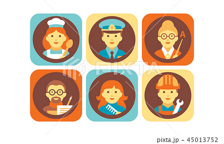 Profession icons set, chef cook, policeman, teacher, writer, hairdresser, builder working people