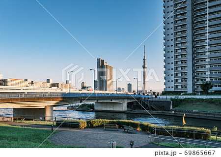 都市風景 東京スカイツリーが見える隅田川沿いの日常風景 東京都荒川区