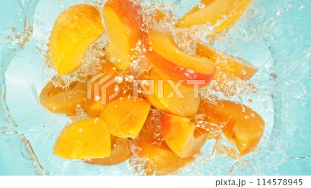 Freeze Motion of Peach Slices Falling into Water, Splashing.