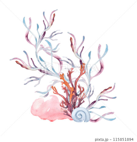 Underwater bouquet with seaweeds and coral reef on watercolor splash. Marine plants monochrome illustration hand drawn in a light pinks and blues. Bright abstract sea plants composition. Summer design
