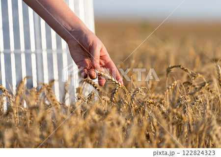 Farmer touches ear of wheat. Close up. Solar panel in the background.