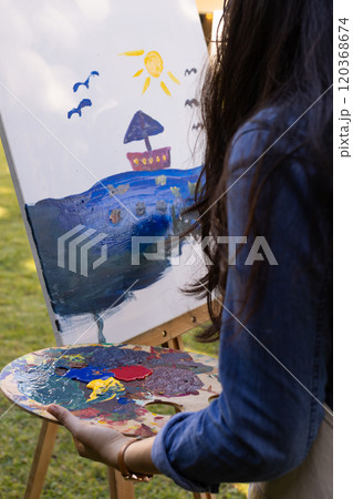 Painting on canvas, woman holding palette and creating outdoor artwork