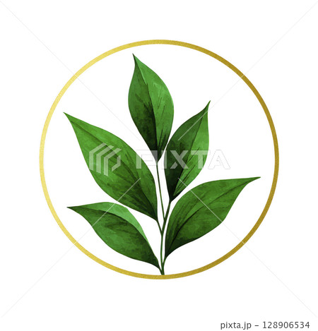 Green leafy plant is encircled by thin gold ring, creating simple and elegant design. leaves are vibrant and detailed, adding natural touch to minimalist composition